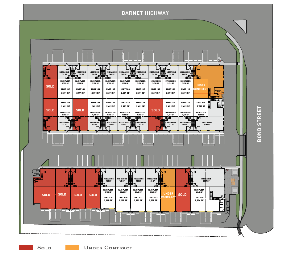 Building One floorplans start from 2,421 sf and up, with prime exposure to Barnet Highway (over 28,000 vehicles per day pass the location). With ideal configurations and extensive glazing, it’s the perfect space for any business needing premium showroom space (flooring distributors, cabinet makers, furniture manufacturers, paint stores, etc.).